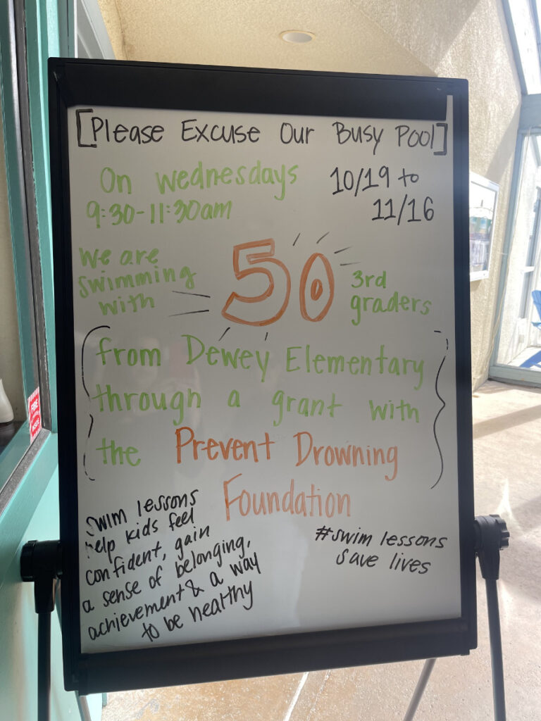 This fall season PDFSD ~ SD Swims Grant was funded for Dewey Elementary. This grant provided swim lessons for the entire 3rd grade class at the local Ryan Family YMCA. Fifty, 3rd graders, were able to have 5 swim lessons in October and November. This was an amazing collaboration between the Dewey Elementary School Administration, SDSU School District, 3rd grade Parents and the Ryan Family YMCA.